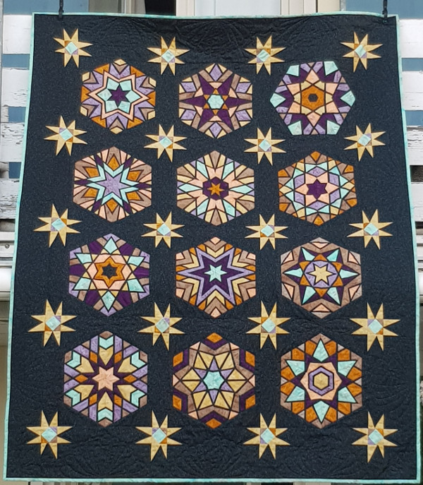 Beim Nähen auf Papier ist es immer sehr schwierig, einen genauen Stoffbedarf vorherzusagen, der Verbrauch ist ganz unterschiedlich, je nachdem, wie man arbeitet. Ich habe vom Hintergrundstoff pro Block etwa 30 cm gebraucht, aber ich verbrauche generell eher viel, manche nähen da deutlich sparsamer. Mit Zwischenstreifen und dem Binding würde ich für den gesamten Quilt von etwa 5 Metern ausgehen. Falls du erst mit dem Nähen auf Papier anfängst, oder etwas Spielraum haben möchtest, um eventuell mal Blöcke, die dir nicht so gut gefallen nochmals nähen zu können, dann gebe einen Meter dazu. Wenn du es ganz genau haben möchtest, suche einen Stoff, von dem dein Quiltshop noch genug vorrätig hat, nähe einen Block, drei Zwischenstreifen und zwei Mittelblöcke und nehme davon die 12-fache Menge.
